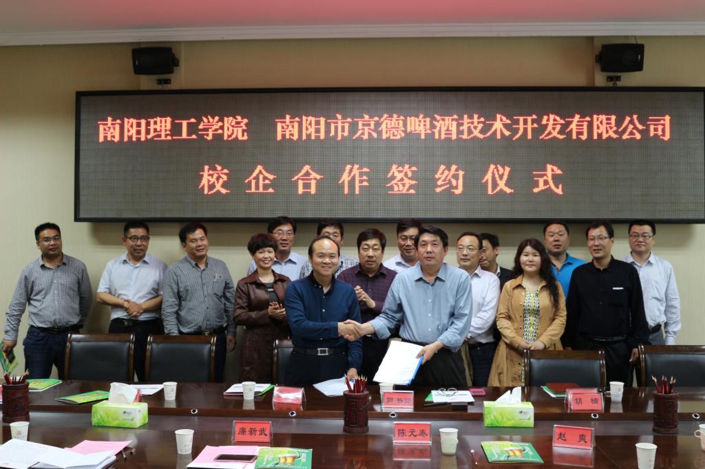 生化学院院长郭书贤代表校方与南阳京德啤酒技术开发有限公司董事长仝奋飞共同签署合作协议。合作主要内容包括:南阳市京德啤酒技术开发有限公司每年向生化学院捐赠5万元,设立“奋飞”奖学助学基金;向生化学院捐赠价值40万元人民币的实验设备,共建产教融合生物工程专业工程化实验室;共建发酵食品协同创新中心和南阳市原浆啤酒工程技术研究中心;建立学生实习就业基地等。
