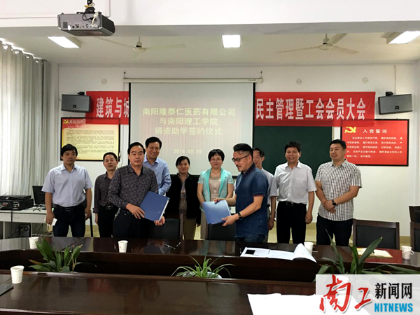 本网讯(特约记者/杨菲)5月23日,南阳隆泰仁医药有限公司与我校捐资助学签约仪式在建筑与城市规划学院会议室举行。副校长张铟,南阳隆泰仁医药有限公司董事长郭学义、中泰医圣堂馆长包飞建出席仪式。建筑与城市规划学院、张仲景国医国药学院、计算机与信息工程学院、校地合作处、教育发展基金会相关负责人参加仪式。