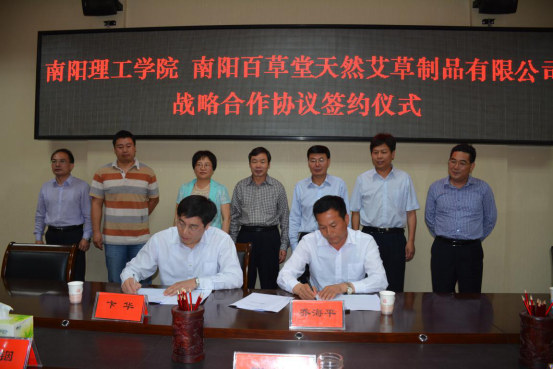 本网讯(记者:武蓓蓓)2016年6月3日上午,南阳理工学院与南阳百草堂天然艾草制品有限公司举行隆重的校企合作签约仪式。出席此次会议的领导有南阳理工学院张伟、张铟两位副校长、校地合作处赵彦普处长、张仲景国医国药学院全体班子成员、南阳百草堂天然艾草制品有限公司的董事长乔海平、邱荣海先生等。