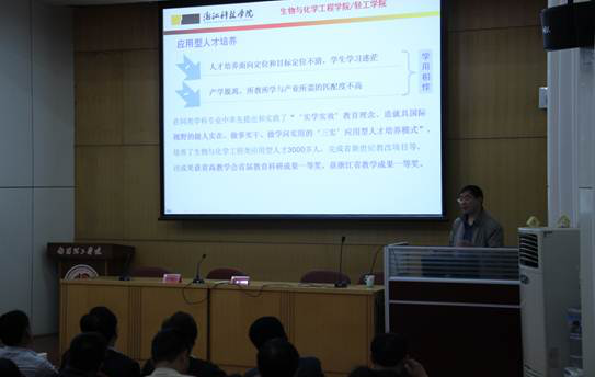 签约仪式后刘士旺教授做了题为“产教融合协同育人”的报告会。他在报告会中向在场师生介绍了生物与化学工程领域应用型人才培养体系的构建与实践,并就该院“实学实效”教育理念、造就具国际视野的做人实在、做事实干、做学问实用的“三实”应用型人才培养模式做了详细的阐述。