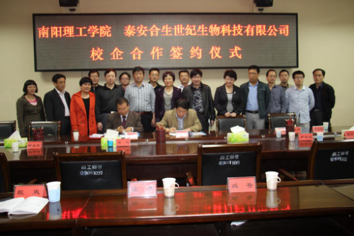 4月26日,南阳理工学院与山东泰安合生世纪生物科技有限公司校企合作签约仪式在中入会馆第一会议室举行。副校长张铟、泰安合生世纪生物科技有限公司董事长周刚毅出席会议。我校教务处、实验设备处、校地合作处负责人、生化学院班子、部分教师参加签约仪式。生化学院党委书记薛刚主持仪式。