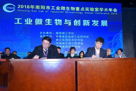随后,在热烈的掌声中,生物与化学工程学院院长郭书贤代表南阳理工学院与中国食品发酵工业研究院副院长程池分别在校院合作协议书上签字。据悉,校院合作内容主要有:双方发挥在工业微生物领域科技创新的优势,共建依托南阳市工业微生物重点实验室,不断增强科技创新和行业服务能力;共同申报河南省工业微生物重点实验室或工程技术研究中心;积极开展工业微生物领域的合作研究、联合申报研究课题,开展科技攻关和技术服务;开展申报专业硕士学位点等工作,共同制订专业硕士培养方案和确定培养方向;发挥各自人才优势,整合资源,建立人才交流机制,增强创新活力等。