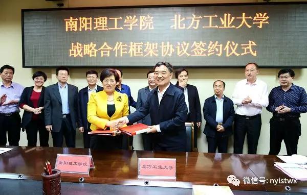 签约仪式上,刘荣英与郑文堂分别代表南阳理工学院和北方工业大学签署了《战略合作框架协议书》。根据协议,未来五年里,南阳理工学院将与北方工业大学在人才培养、学科建设、科学研究、行政管理等方面开展合作,利用各自的优势,互相支持建设、发展,积极开展研究生联合培养、学科对口支援、共建协同创新中心、教育资源共享、设立专项基金、联合申报国家级或省部级重大科技攻关项目、开展横向课题研究等合作共建项目,进一步推进两校合作,促进双方发展,支持南阳理工学院建设高水平应用技术型大学,提升南阳理工学院学科整体水平,提高综合办学效益,以回馈、反哺、服务、助推南阳区域产业转型升级。