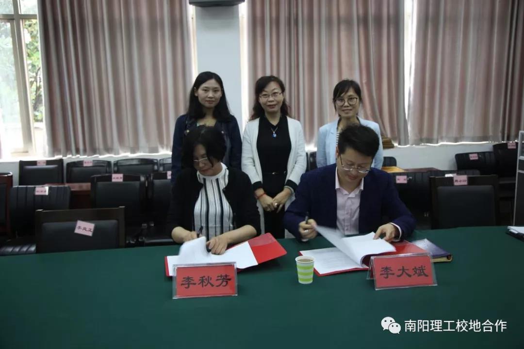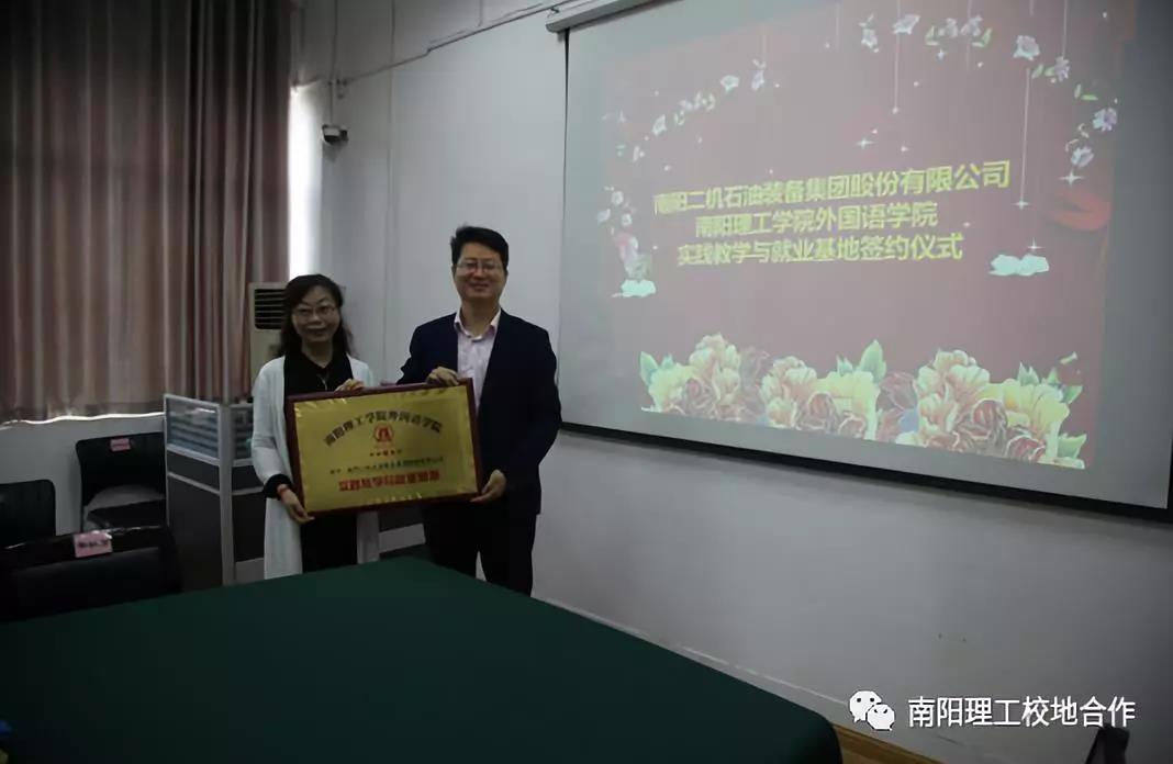 签约仪式上,赵万哲首先介绍了该院的专业设置、人才培养方案、特色课程、师资力量等,并希望与对方开展多元立体式合作。接着李秋芳介绍该院的校地校企合作基本情况,并希望双方加强反馈以实现高校人才培养与地方企业经济发展需求的无缝对接与完美契合。随后李大斌介绍了南阳二机集团的基本情况、发展状况和未来走势。他希望外国语学院能够继续培养出大批具备良好商务沟通与组织能力的人才以满足公司发展对人才的需求。最后,双方举行了南阳二机石油装备集团股份有限公司实践教学与就业基地的签约及授牌仪式。