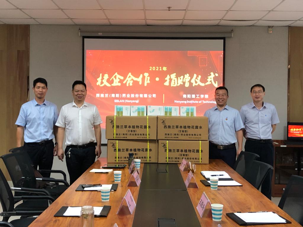 本网讯(特约记者/杨思佳)7月9日上午,大学科技园9楼会议室举行了“校企合作捐赠仪式”,校地合作管理与服务中心副主任杨怀坦代表学校接受了校企合作企业西施兰(南阳)药业股份有限公司捐赠的由我校黄显章博士团队研发的艾草驱蚊花露水产品,并进行了座谈会。西施兰公司办公室主任代表徐继松,张仲景国医国药学院党委书记段焰,河南省张仲景方药与免疫调节重点实验室副主任黄显章,以及团队成员张超云、等教师代表和校地合作管理与服务中心成员参加了仪式。