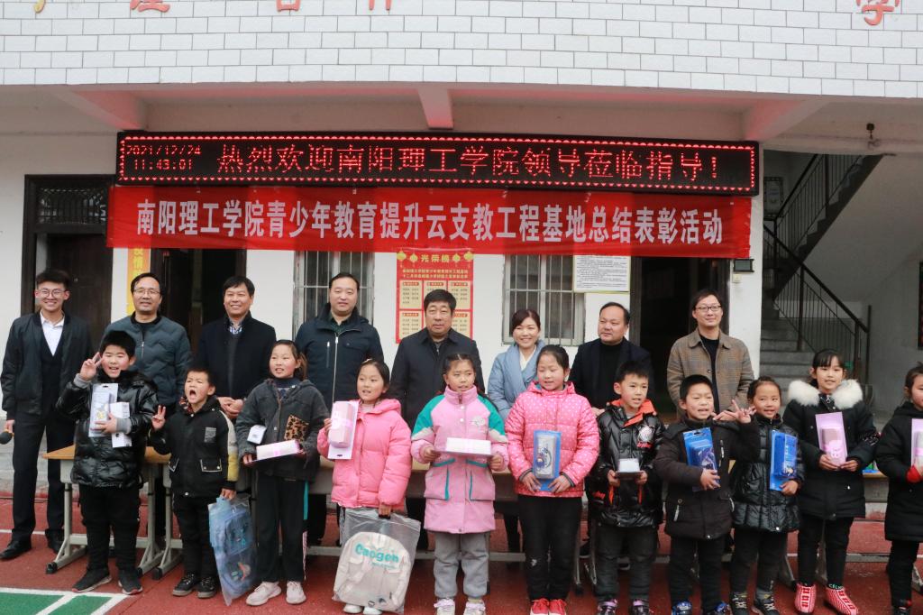 本网讯(特约记者/陈连山)12月24日,副校长肖泽昌一行前往南召县四棵树乡高峰庵小学参加青少年教育提升云支教工程基地总结表彰活动,并为受表彰的学生颁发奖品。南召县副县长冯潇然、四棵树乡党委班子成员参加活动。