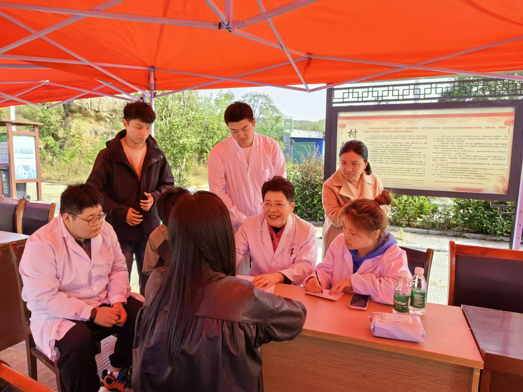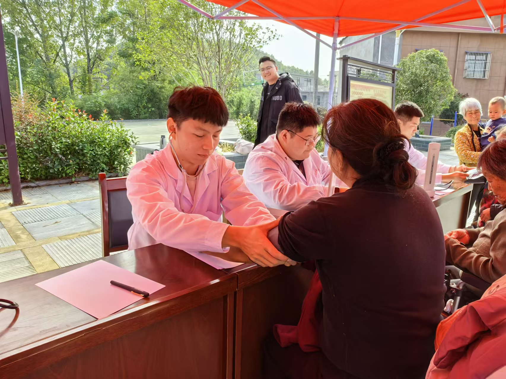 活动现场,群众热情高涨,咨询者络绎不绝。义诊团队的教师们充分利用各自的专业特长,不仅为群众测量血压、号脉听诊、细致询问病史,还结合医学常识,针对不同体质与人群,精心开出了中医调理处方与治疗方案,旨在帮助群众树立正确的健康观念,引导其形成良好的生活习惯。学生志愿者们则在一旁积极协助,细心记录就诊信息,同时通过观察学习老师们的诊断逻辑与沟通技巧,不断提升自我。他们耐心细致地为群众答疑解惑,普及健康生活方式,用实际行动传递关爱。义诊团队的认真与专业,赢得了现场群众的广泛赞誉与热烈欢迎,大家纷纷表示,希望未来能有更多类似的惠民医疗服务活动走进乡村。