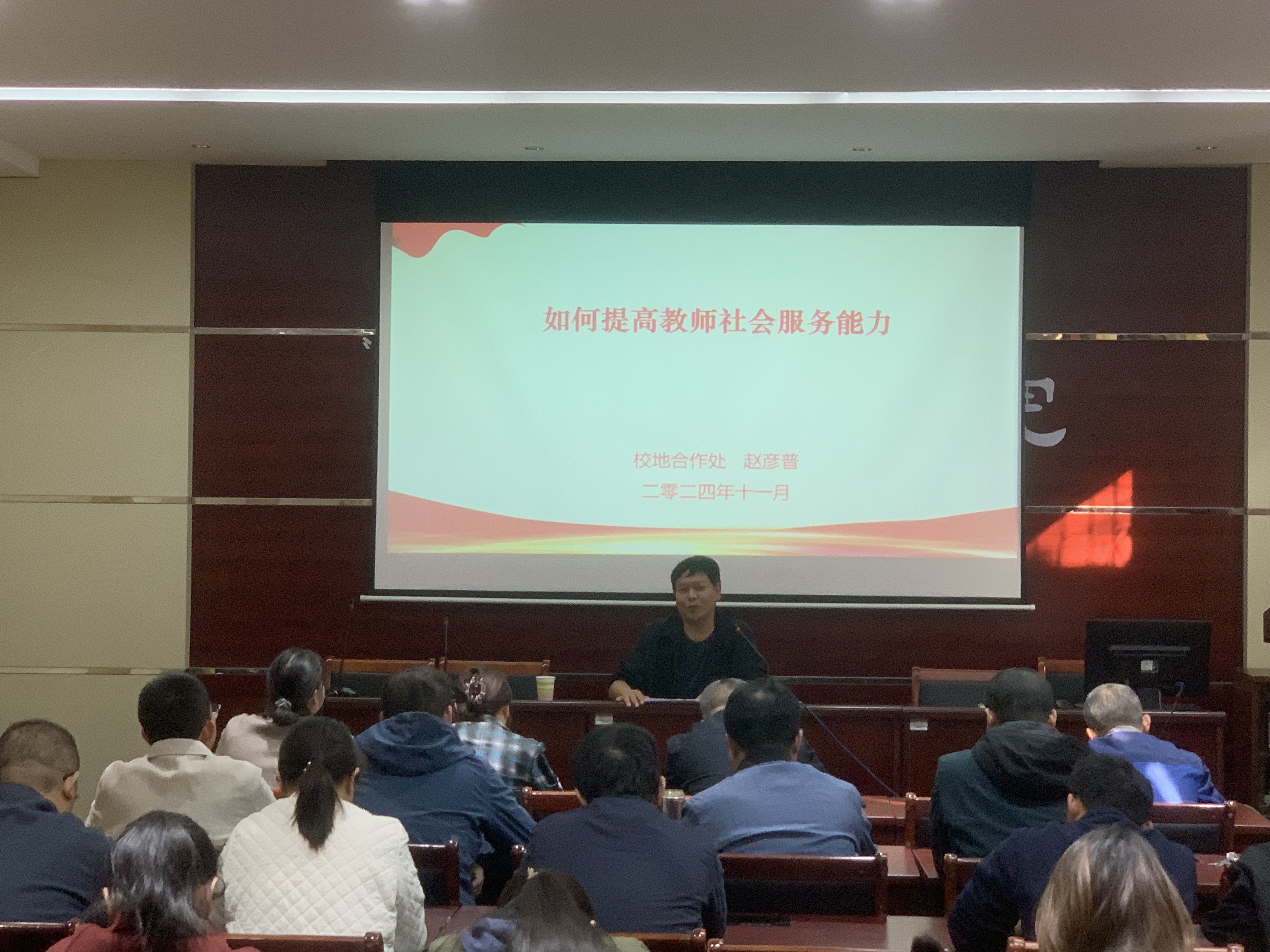 2024年11月5日,校地合作管理与服务中心主任赵彦普一行应邀前往建筑学院,开展了《如何提高教师社会服务能力》专题培训。