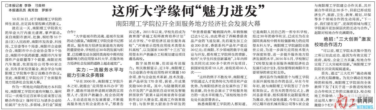 熟悉南阳理工学院的人都知道,它是南阳人民自己的一所专科学校,经过30年的春华秋实,已成长为在全国同类高校中拥有较强影响力的应用型本科大学。南阳理工学院副院长陈世云说,为进一步深化应用技术型大学深度转型,进一步提升服务地方经济发展的水平,2016年5月,学校制订了《转型发展全面服务南阳经济社会发展行动计划》,很快便得到南阳市主要领导的肯定和支持。