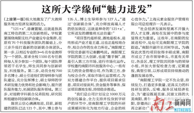 “这样的例子不胜枚举,南阳理工学院通过人才优势转化为项目和产业优势,为南阳经济社会发展作出了积极贡献,向全社会展示了学校服务地方的一流水平和能力。”该校校地合作处处长赵彦普表示。