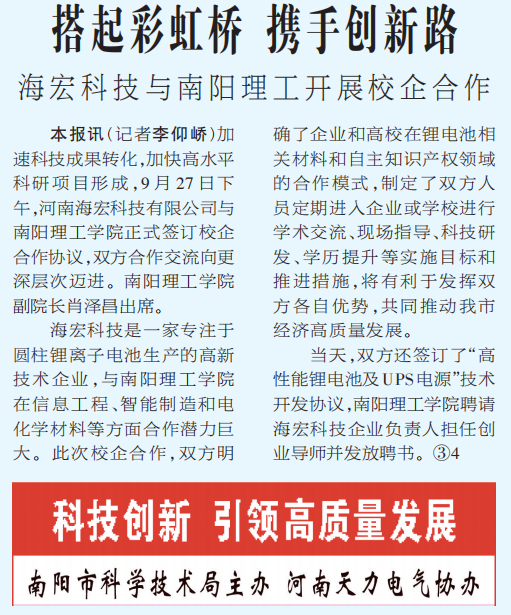 海宏科技是一家专注于圆柱锂离子电池生产的高新技术企业,与南阳理工学院在信息工程、智能制造和电化学材料等方面合作潜力巨大。此次校企合作,双方明确了企业和高校在锂电池相关材料和自主知识产权领域的合作模式,制定了双方人员定期进入企业或学校进行学术交流、现场指导、科技研发、学历提升等实施目标和推进措施,将有利于发挥双方各自优势,共同推动我市经济高质量发展。