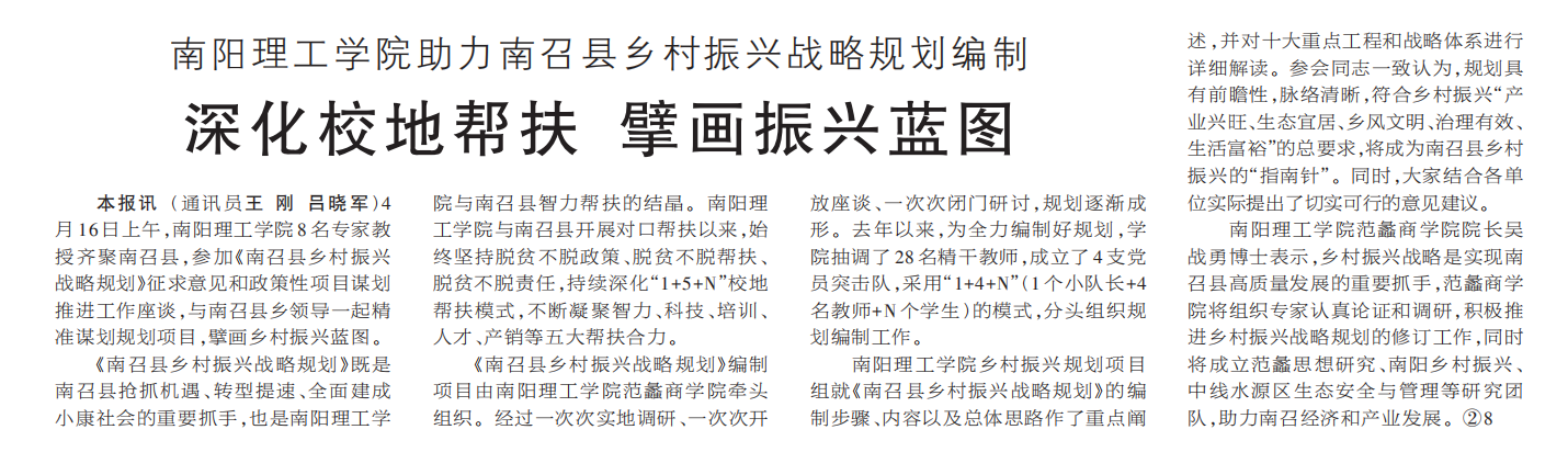 《南召县乡村振兴战略规划》既是南召县抢抓机遇、转型提速、全面建成小康社会的重要抓手,也是南阳理工学院与南召县智力帮扶的结晶。南阳理工学院与南召县开展对口帮扶以来,始终坚持脱贫不脱政策、脱贫不脱帮扶、脱贫不脱责任,持续深化“1+5+N”校地帮扶模式,不断凝聚智力、科技、培训、 人才、产销等五大帮扶合力。
