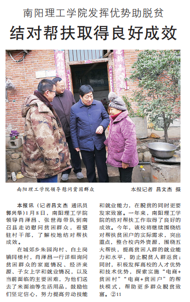 本报讯(记者吕文杰通讯员郭兴华)1月8日,南阳理工学院领导肖泽昌、张世海带队到南召县走访慰问贫困群众,看望驻村干部,了解校地结对帮扶成效。