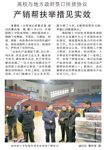 南阳理工学院始终把服务南阳经济社会发展作为义不容辞的使命和责任,高度重视校地合作结对帮扶工作。自从与南召县政府签订精准扶贫协议以来,学校围绕人才智力帮扶、科技帮扶、培训帮扶、人才帮扶和产销帮扶开展了一系列工作,取得了明显成效。南召县农副产品进校园,就是学校与南召县产销帮扶的举措之一。据统计,此次展销活动共帮助南召县销售农产品50余万元。